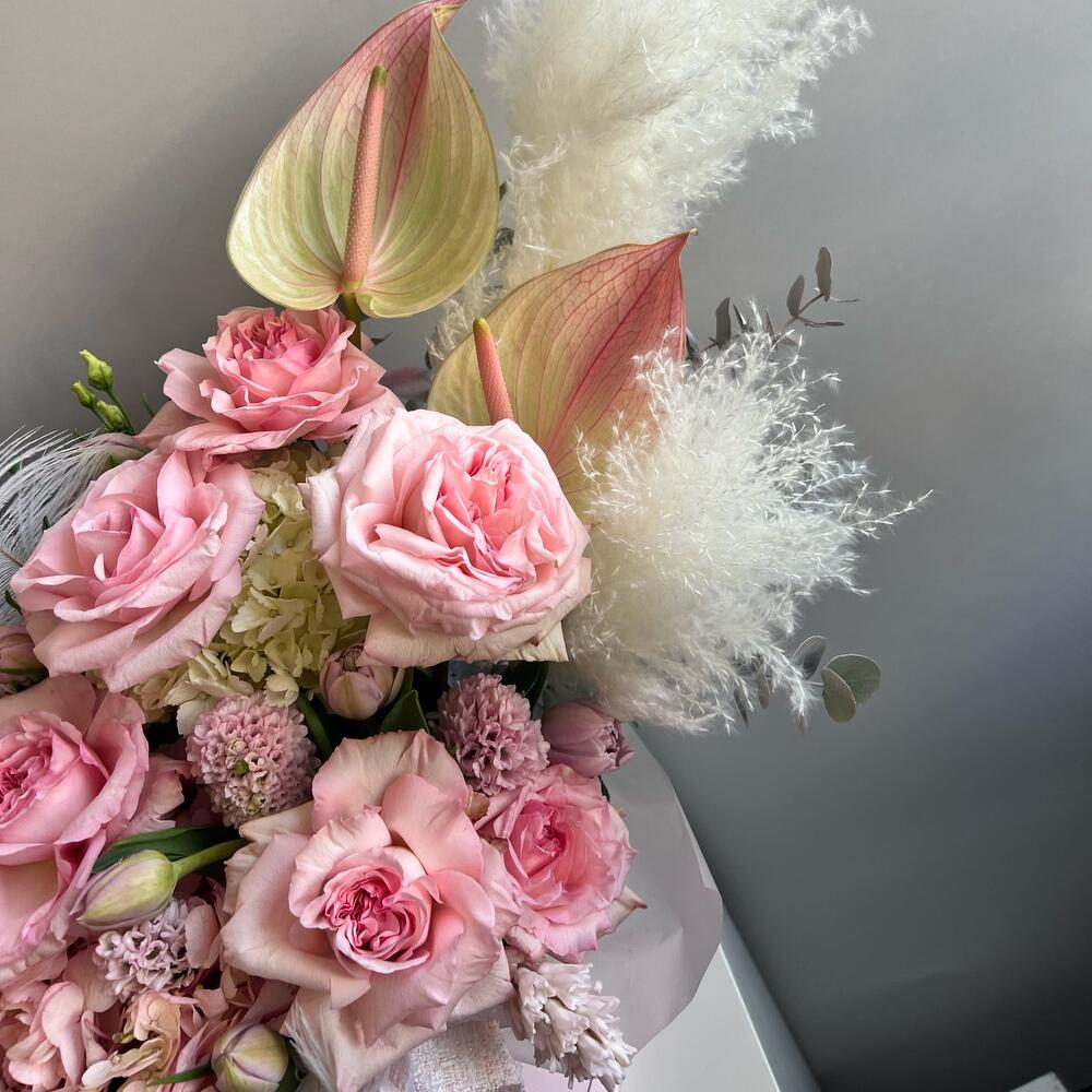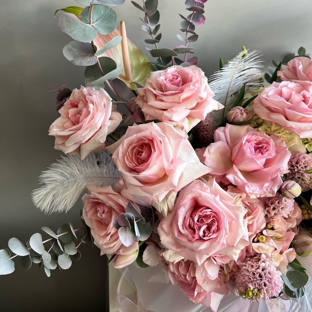 Presented in a stylish hatbox adorned with ribbons, this bouquet is a visual and sensory delight. The peony-shaped tulips and Pink O’Hara roses bring softness and romance, while the Baby Blue eucalyptus and geocity add volume, structure, and a subtle aromatic freshness. The exotic anthuriums lend a modern, luxurious edge, and the decorative feathers provide a playful yet elegant finishing touch.