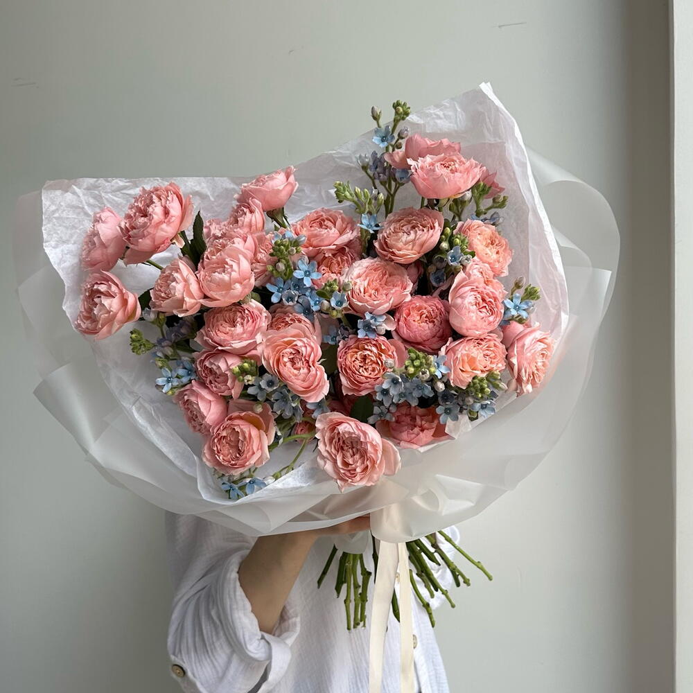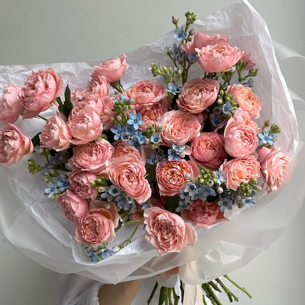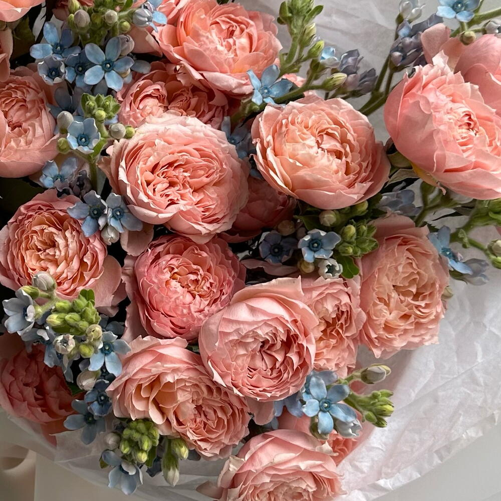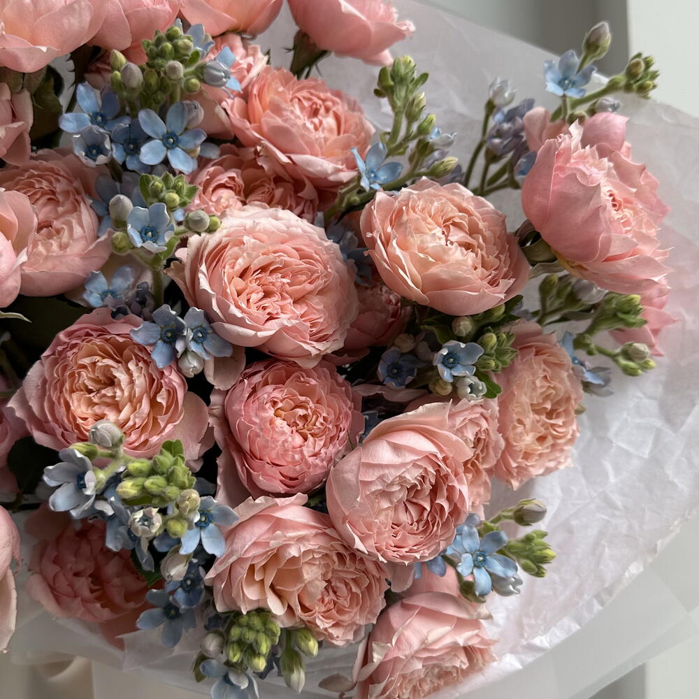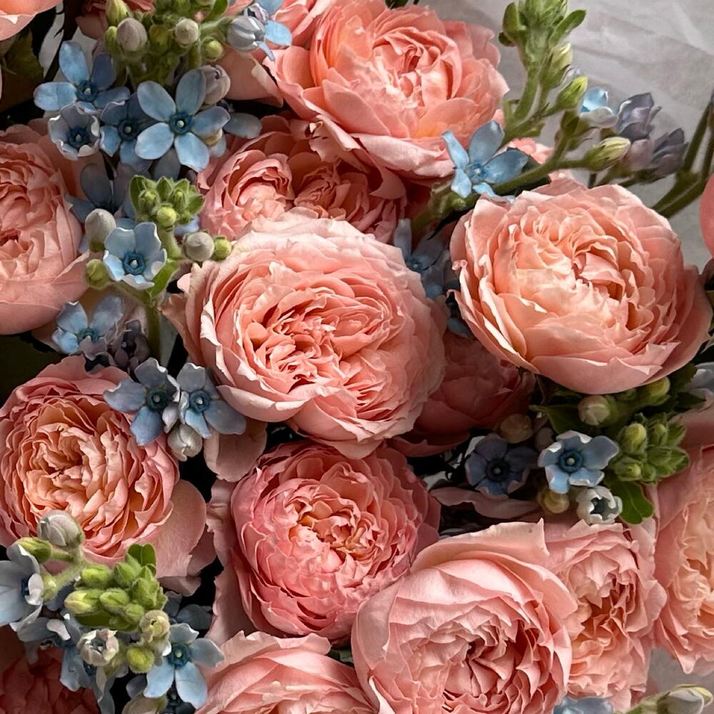 Nestled among them are tiny, airy blue flowers, cool and calming, like fragments of a spring sky caught between the roses. Their small, star-shaped faces add lightness and contrast, making the pink tones glow even more warmly. Fresh green buds and slender stems weave through the arrangement, giving it a sense of movement, as if the bouquet is still growing, still alive with possibility.